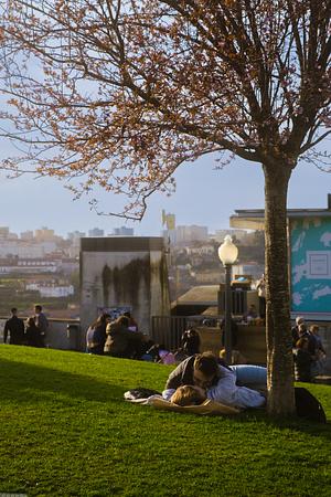 Couple kissing on grass in Jardim do Morro